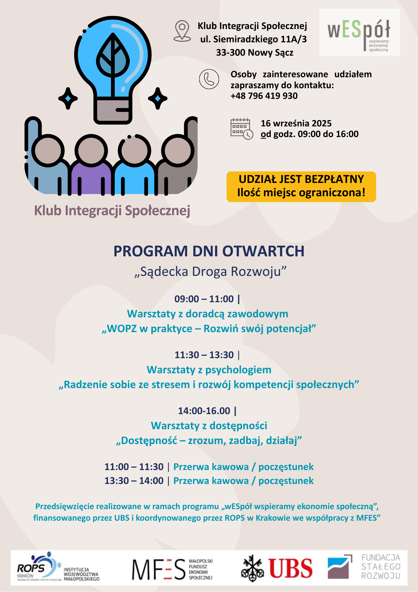 Przedsięwzięcie realizowane w ramach programu „wESpół wspieramy ekonomie społeczną”, finansowanego przez UBS i koordynowanego przez ROPS w Krakowie we współpracy z MFES