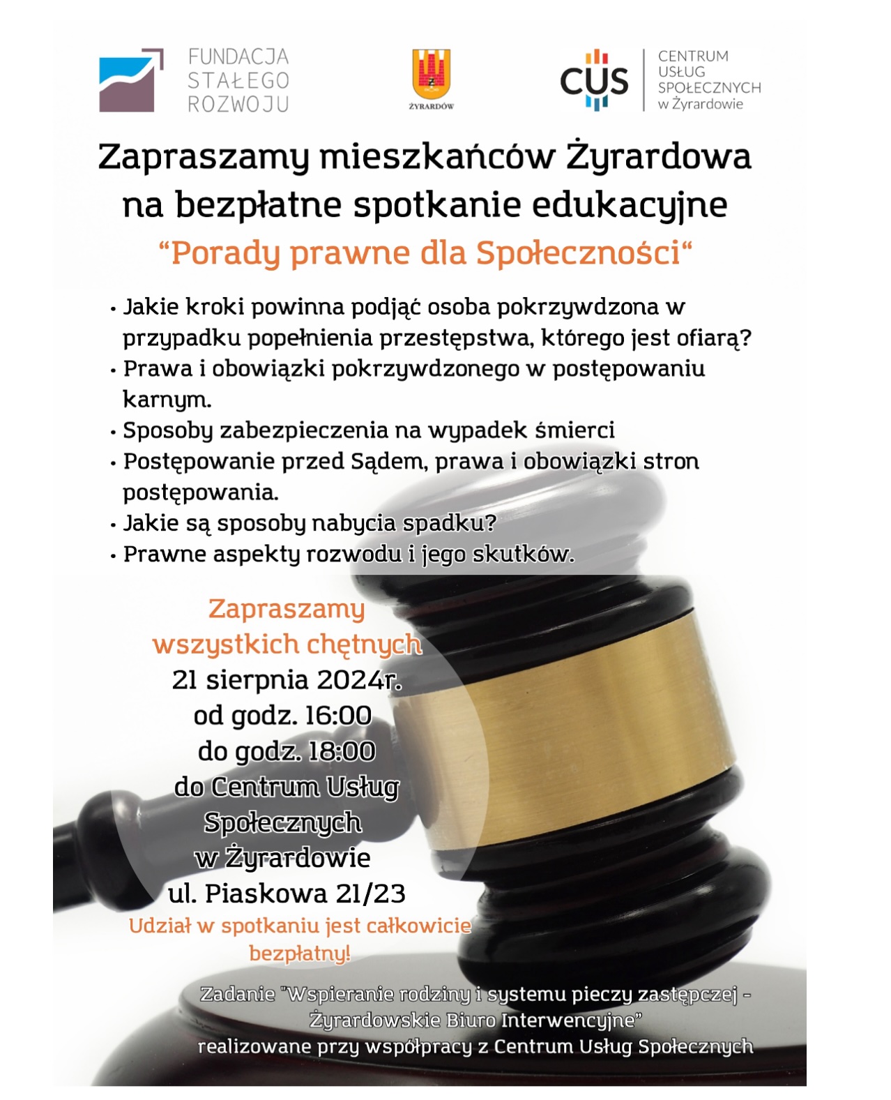 Przedmiotem realizacji zadania jest wspieranie osób w trudnych sytuacjach życiowych (kryzysowych), w tym świadczenie usług poradnictwa prawnego. Zadanie będzie polegać na prowadzeniu poradnictwa prawnego w ramach funkcjonowania Żyrardowskiego Biura Interwencyjnego dla mieszkańców Żyrardowa, gdzie w sytuacji kryzysowej można uzyskać doraźną pomoc oraz organizacji spotkań edukacyjnych dla mieszkańców. Żyrardowskie Biuro Interwencyjne będzie funkcjonować w siedzibie Centrum Usług Społecznych w Żyrardowie.